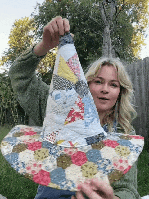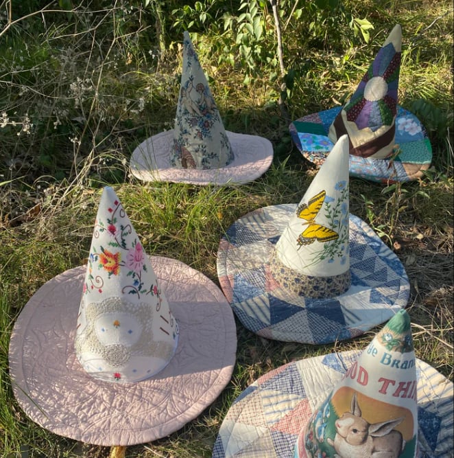 I carefully select vintage quilts—each with its own past—and transform them into unique witch hats brimming with rustic charm. No two hats are alike, just like the stories they carry