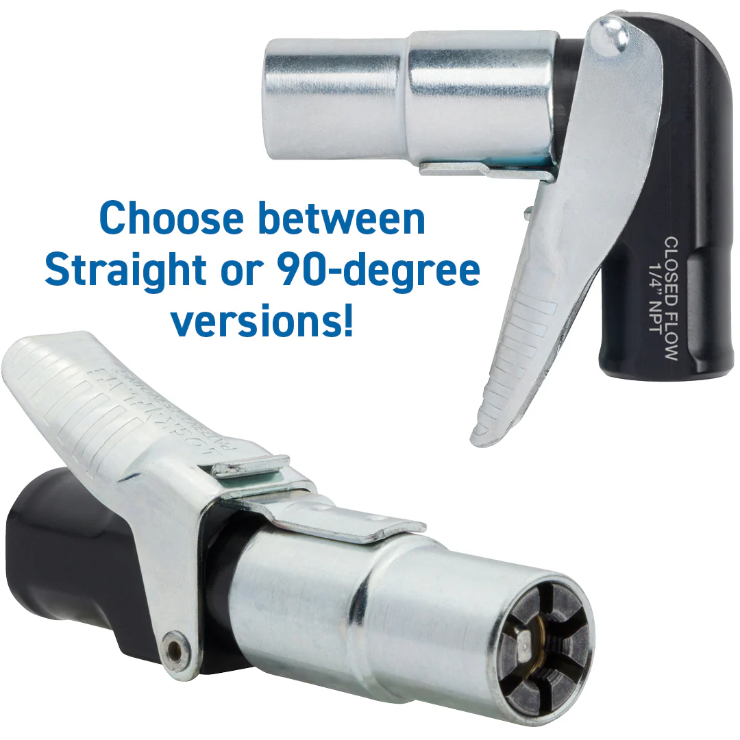 CLOSED FLOW: Must engage the tire valve for air to flow. For use directly from a compressor or air hose. - If used with a multi-hose inflation , use CLOSED FLOW LockNFlate Air Chucks.