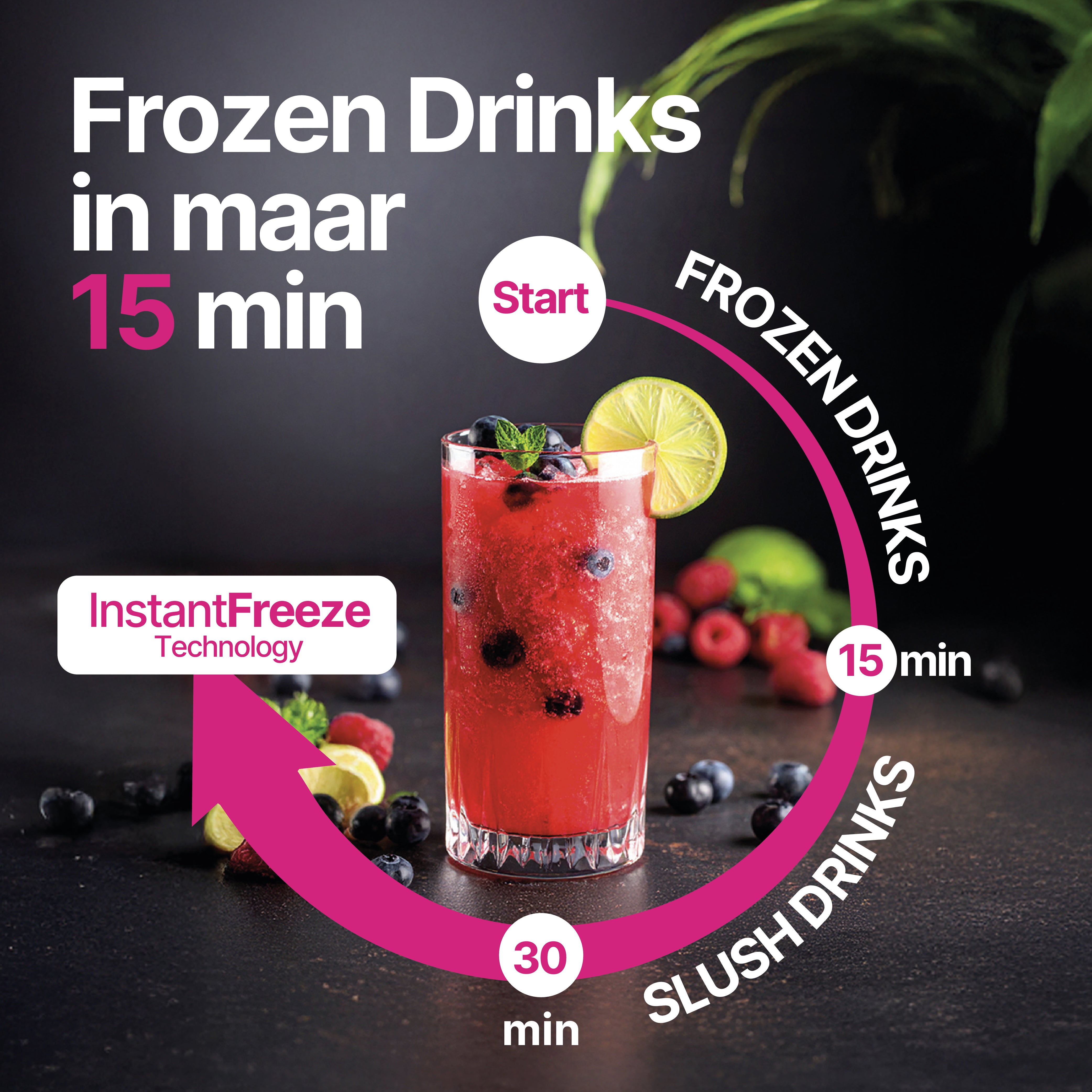 Bereid je basis, vries deze 24 uur in, plaats het in de machine en selecteer een programma. Met de afteltimer zie je precies hoelang het nog duurt. Geen geduld? Maak dan direct een milkshake zonder vooraf te vriezen.