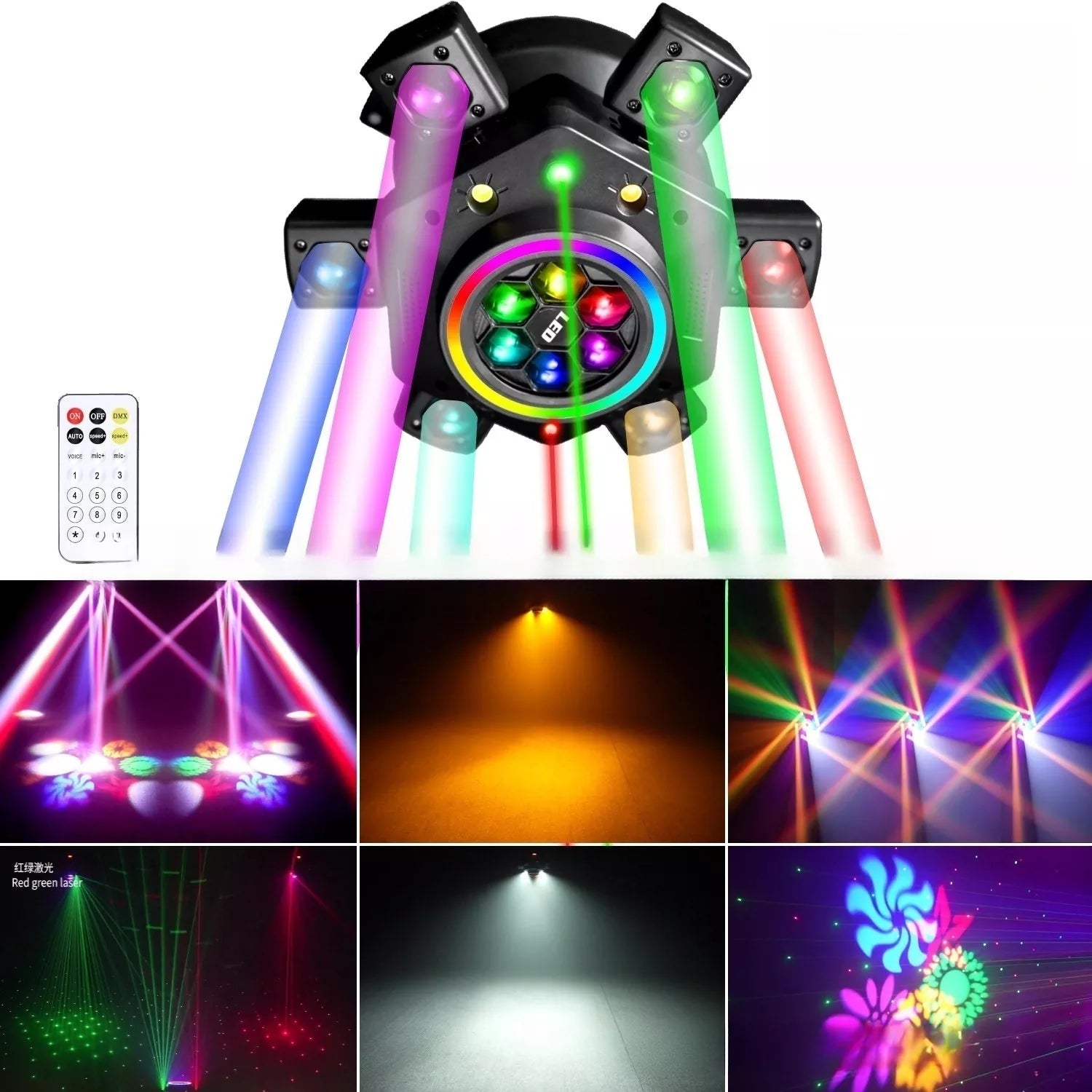 - Lamp parameters: 6 CREE 10W RGBW lamp beads, 1 15W RGBW lamp bead, 100mW red laser, 2 50mW green lasers, 10W white light strobe, 2 10W golden light strobe